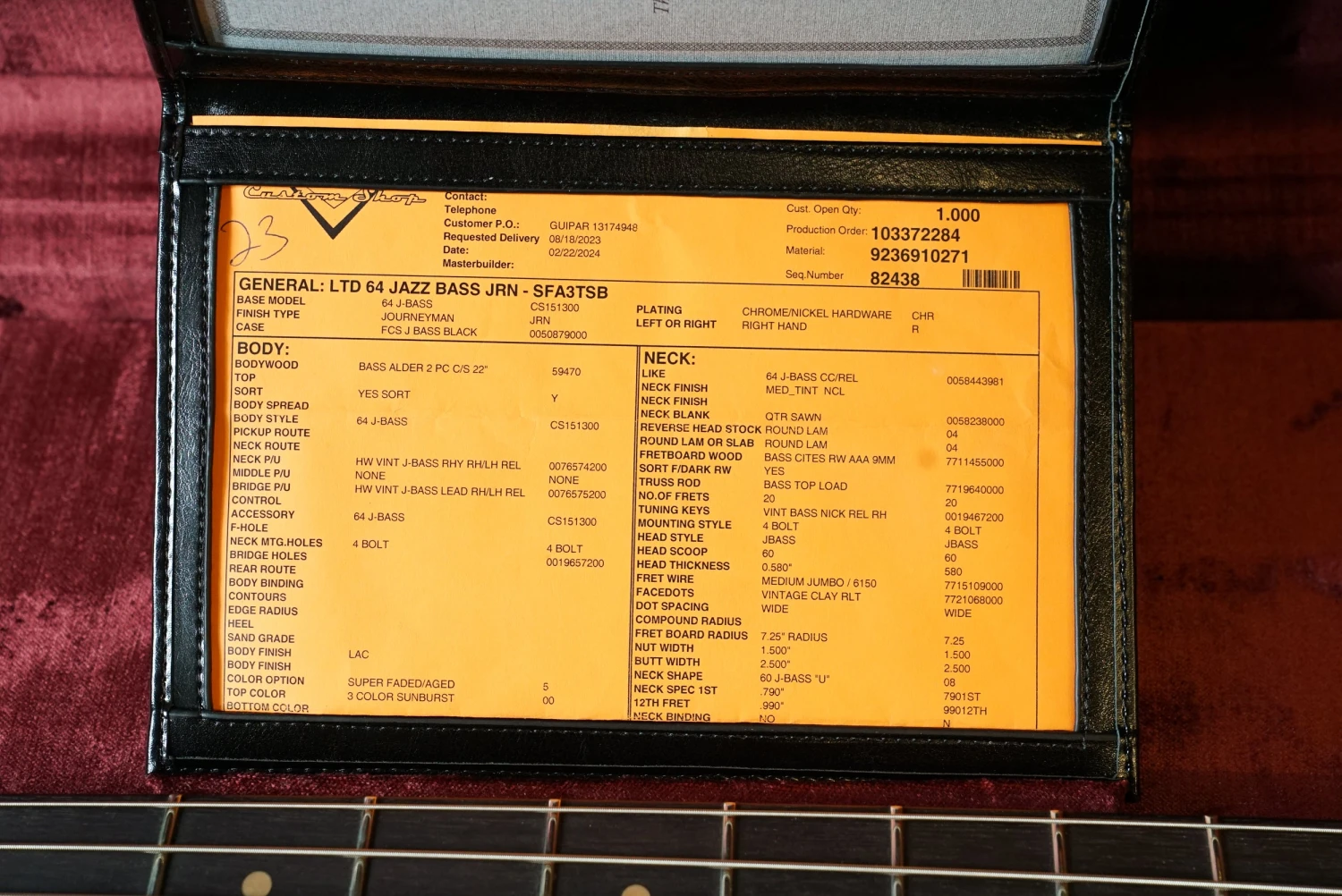Ordered from the 2023 custom shop limited edition catalogues, please see build sheet below: